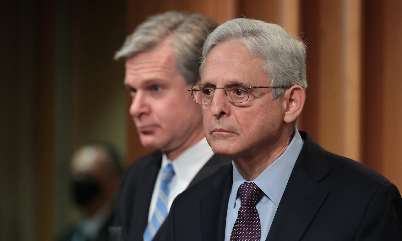 U.S. Attorney General Merrick Garland, right, and FBI Director Christopher Wray hold a press conference on the REvil ransomware attacks. (Photo by Chi...